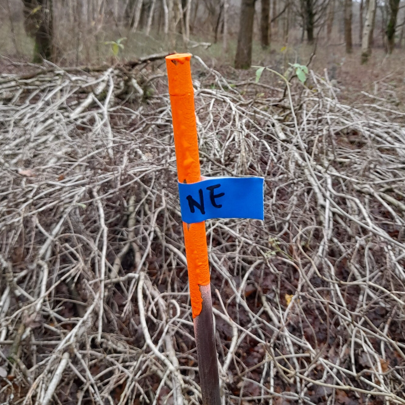 Met bamboestokken plantlocaties markeren in open plekken. Hier wordt bosplantsoen geplant, in groepen van 5 of 25 stuks inheems loofhout.